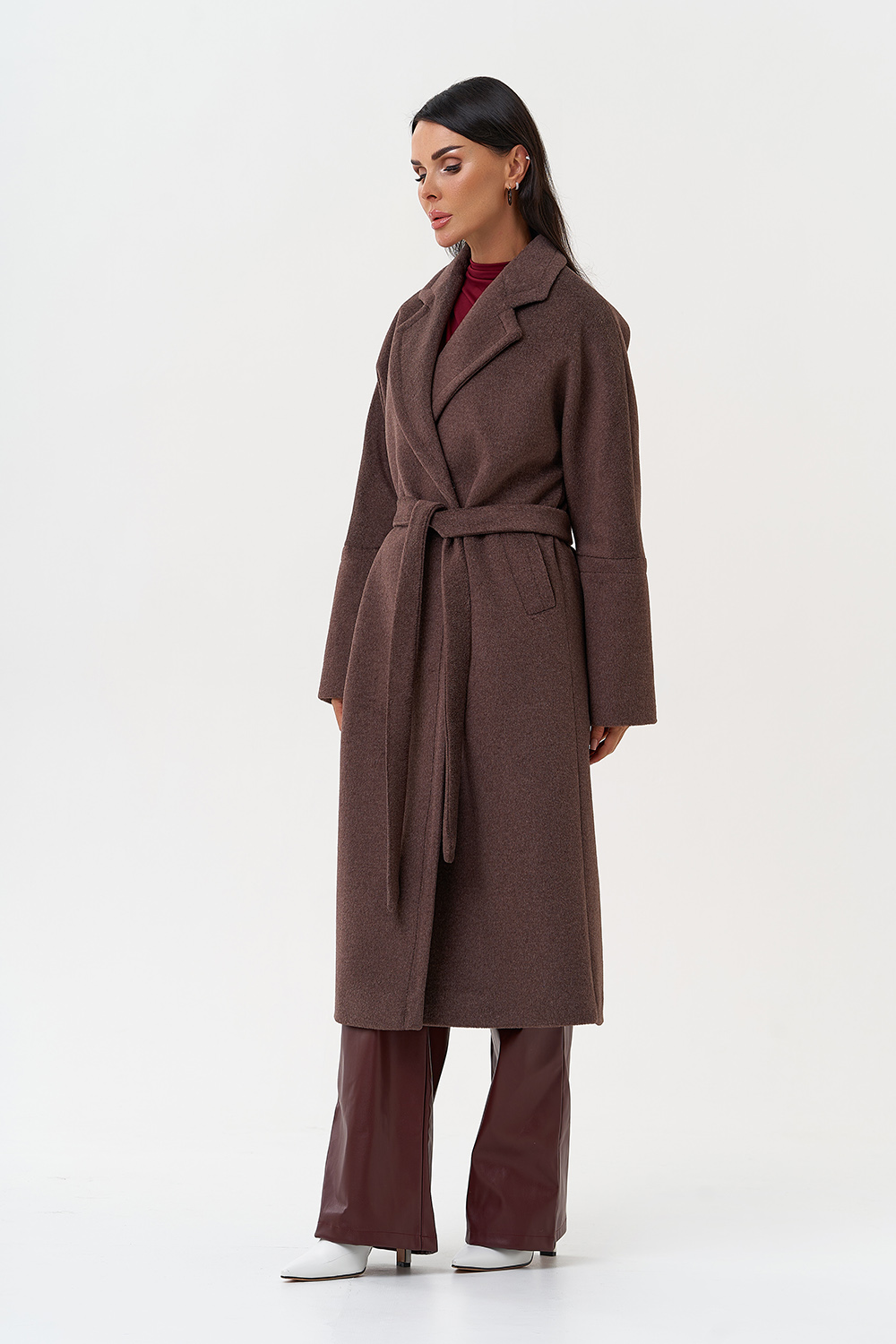 Силуэт - прямой Цвет - коричневый Длина - 115 см Вид полотна - тканое Состав полотна - шерсть 80%, п/э 20% Вид застежки - кнопки Крой воротника - английский воротник Фасон рукава - спущенное плечо, длинный Фасон кармана - прорезной Пояс |