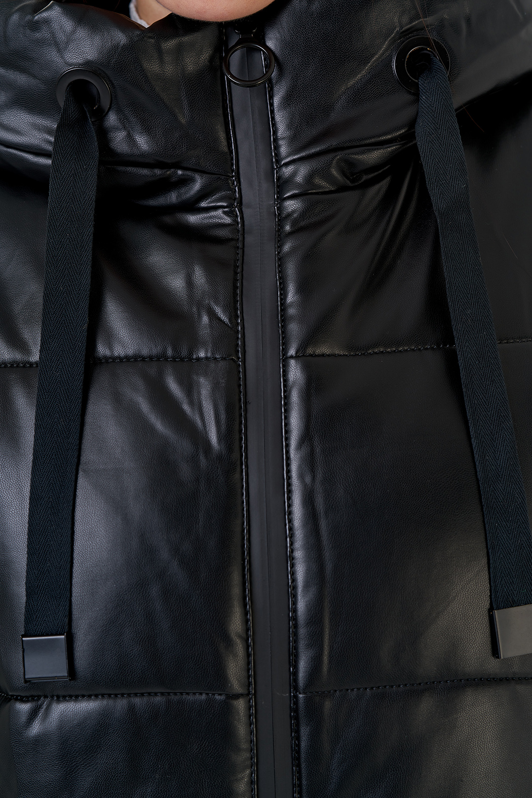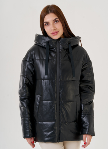 Пуховик в классическом черном цвете с капюшоном. Модель выполнена из эко кожи, что позволяет ей быть надежной и эластичной. Капюшон укроет от осадков. Рукава с напульсниками защитят от ветра. По бокам имеются карманы. Пуховик утеплен верблюжьей шерстью, которая защитит вас в зимние холода.